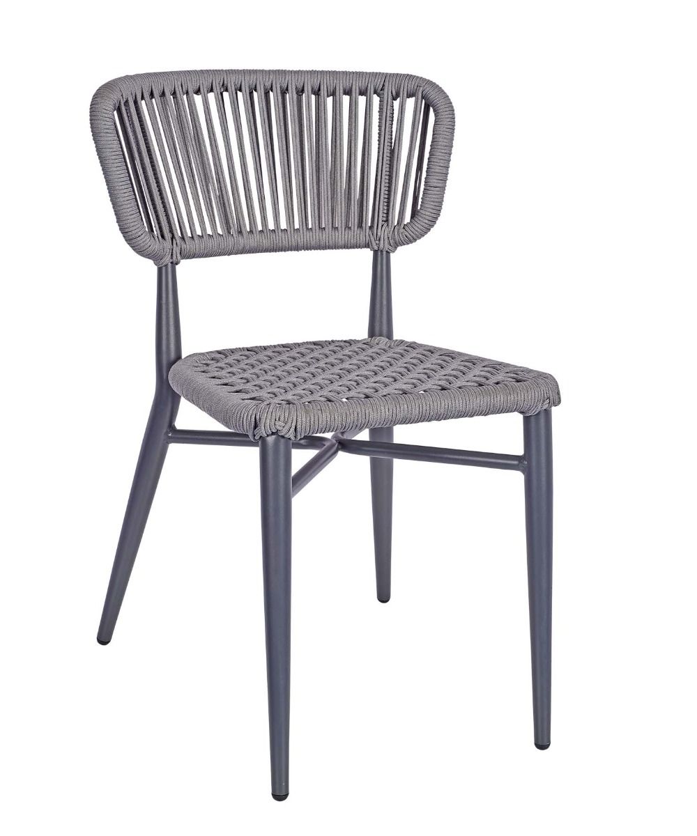 A modern outdoor sidechair with a grey or natural coloured aluminium frame and rope weave seat and back.